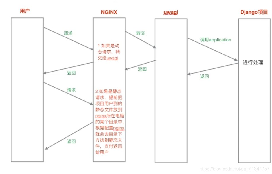 如果是动态请求,则将请求转发给uwsgi服务器,uwsgi调用我们的django进行处理请求,然后一步一步的再返回。
