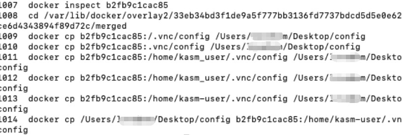 docker cp b2fb9c1cac85:/home/kasm-user/.vnc/config /Users/用户名/Desktop/config