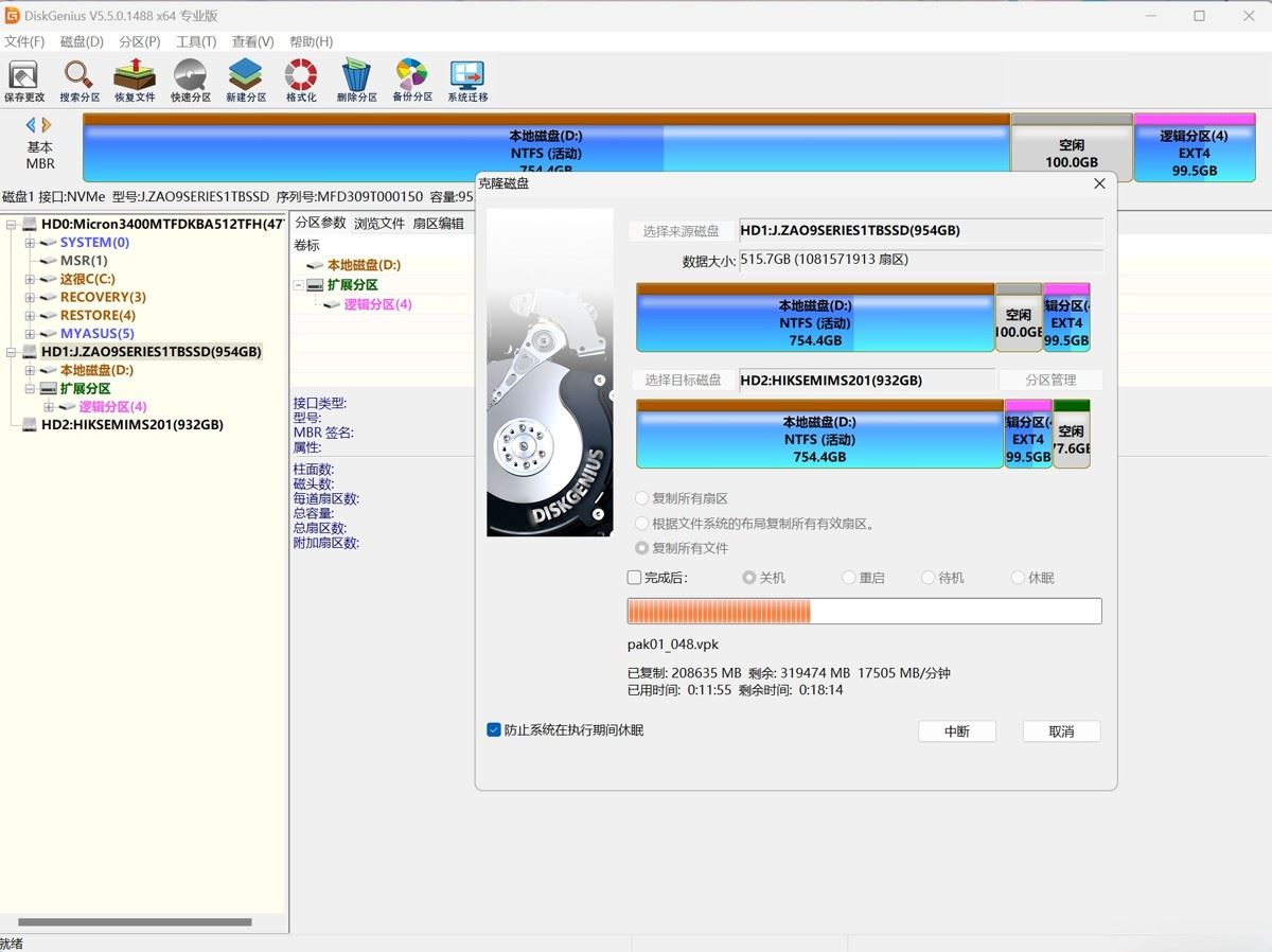 无论扩容是否成功,请先进行数据克隆。笔者这里就找了一根1TB的硬盘对磁盘1进行全盘拷贝。
