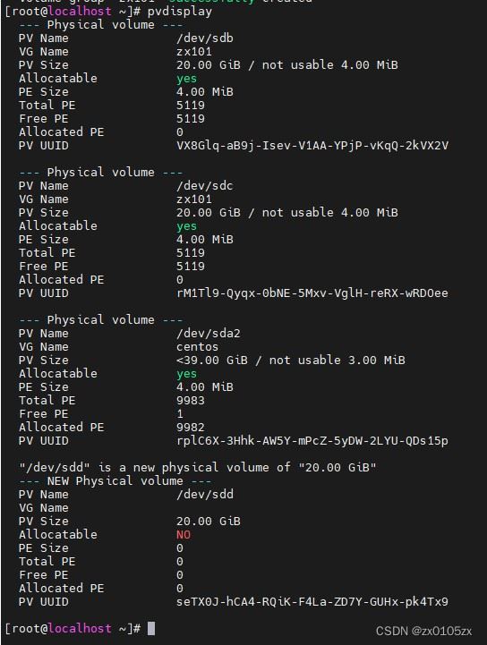 2)创建物理卷 /dev/sdb /dev/sdc /dev/sdd 并查看