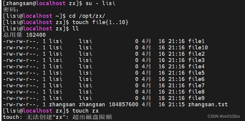 给zhangsan用户设置容量限制,lisi用户设置文件数量限制