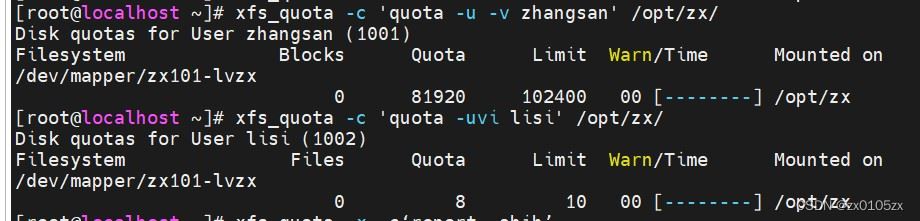 xfs_quota -x -c 'report -a' #查看所有可用分区的磁盘容量配额使用情况