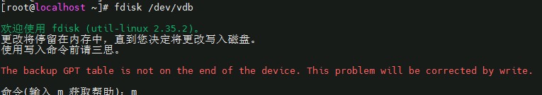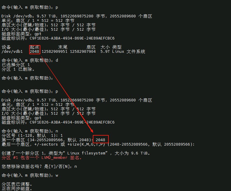 fdisk /dev/vdb p ###打印现有的分区情况,此处需要记录当前的扇区起始位置 d ###删除当前的分区 p ###删除后可以再次查看 n ###新建一个分区,起点与原有扇区起点相同 w ###写入分区信息