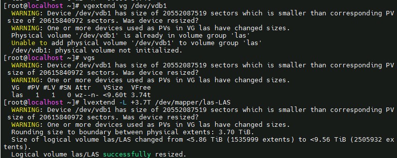 vgextend las /dev/vdb1 ###将物理卷/dev/vdb1添加至卷组las中 lvextend -L +3.7T /dev/mapper/las-LAS ###对lv的扩容