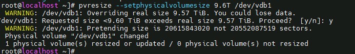 pvresize --setphysicalvolumesize 9.6T /dev/vdb1