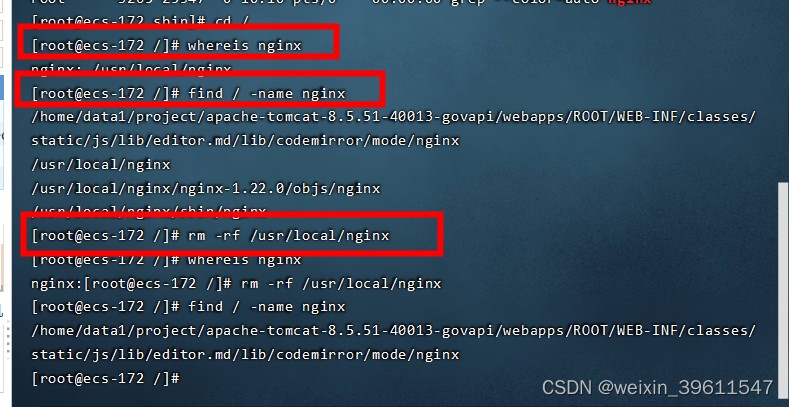 查到之后发现都在 /usr/local/nginx 下,所以执行删除命令