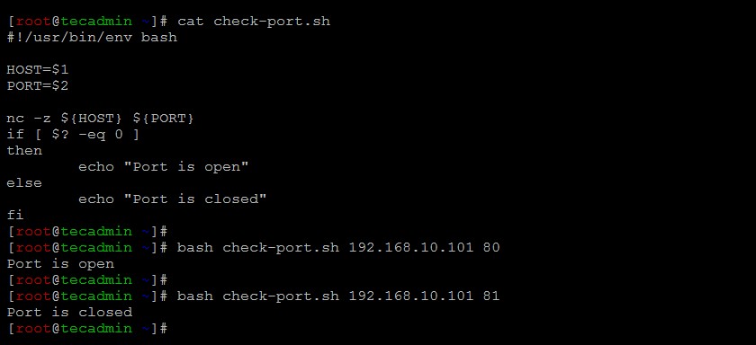 这里 HOST 是远程或本地主机系统的主机名或 IP 地址。PORT 是要检查的端口号。,nc 命令可以连接到主机上的任何端口并返回状态。$? 是一个系统环境变量,包含最后一个命令的退出状态。