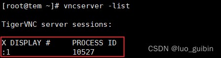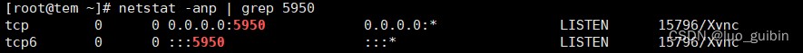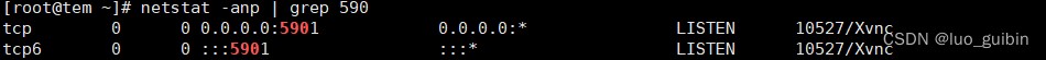 vncserver :1 #1表示开启的是5901端口,1--5901,5901为客户端连接端口号,2--5902,以此类推,可同时开启多个端口 vncserver -list #可查看已开启的端口列表 netstat -anp | grep 5901 #查看5901进程