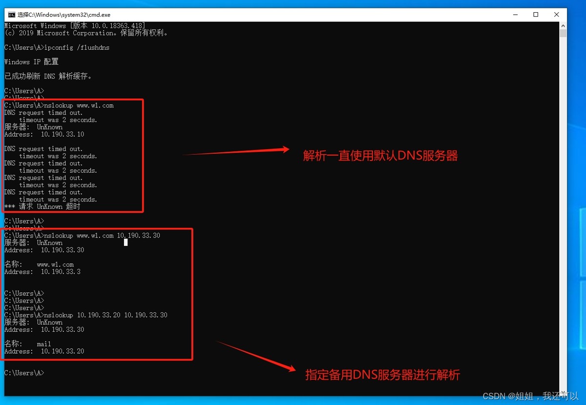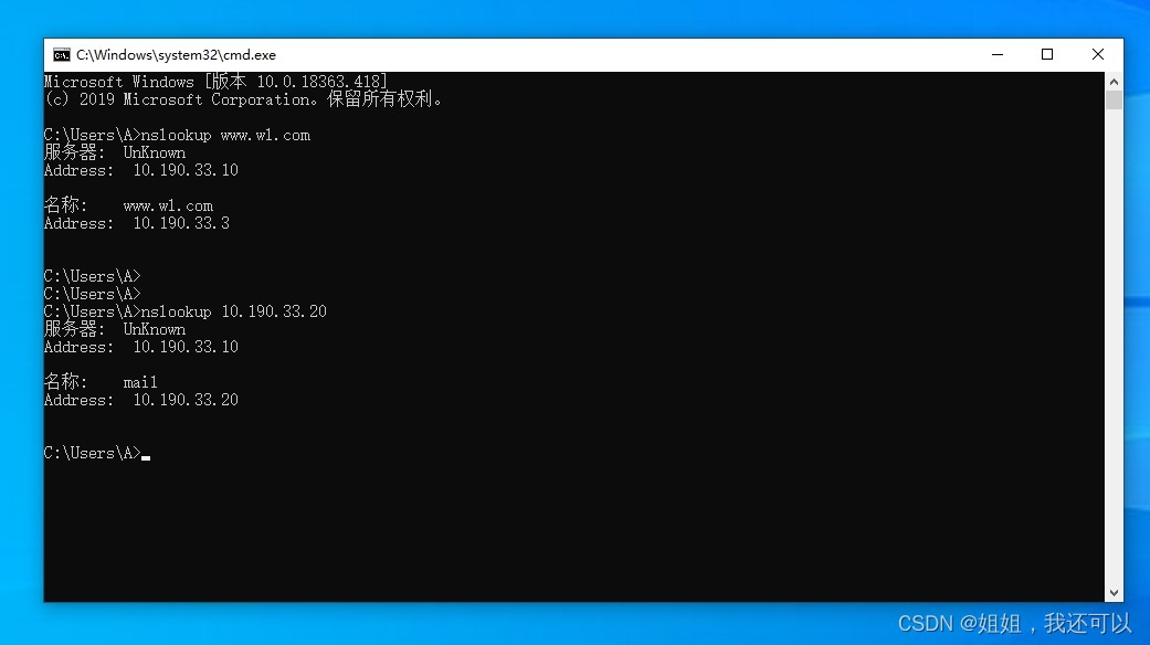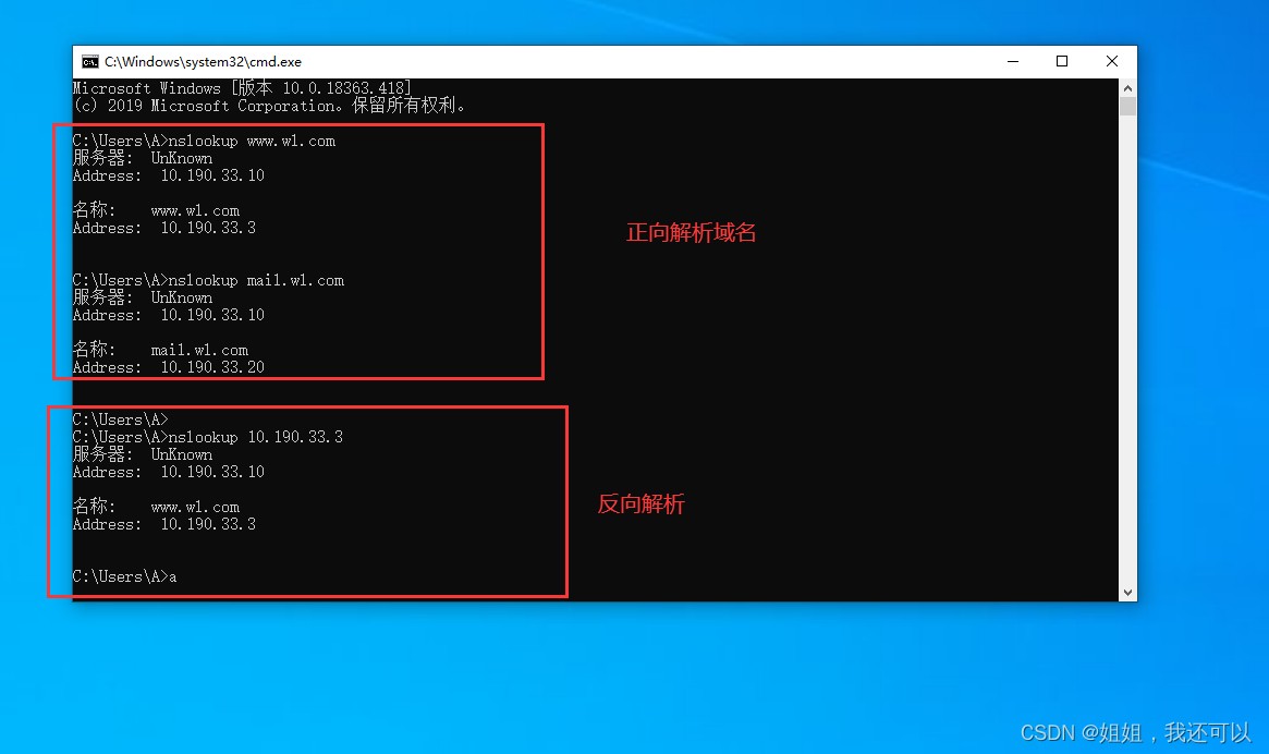 ## 同时按win键+R键,(先win后R),调出“运行”对话框,然后输入cmd,点确定。 ipconfig/all ##查看本机所有网卡配置 ping 10.190.33.10 ##pingDNS服务器地址,确保可以和DNS服务互相通信 nslookup www.wl.com ##解析域名“www.wl.com” nslookup mail.wl.com nslookup 10.190.33.3