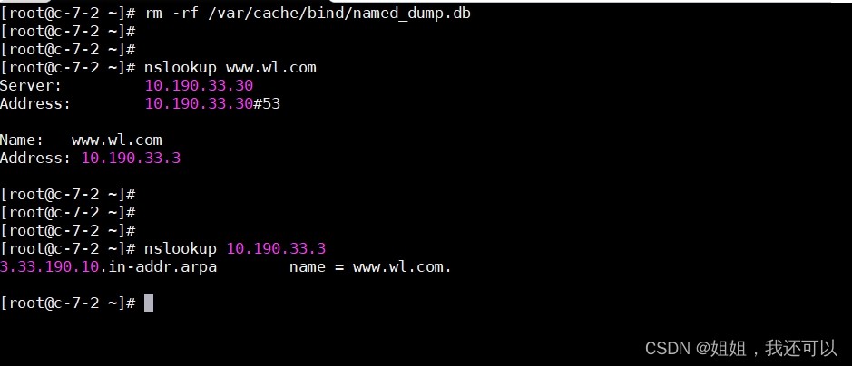 rm -rf /var/cache/bind/named_dump.db nslookup www.wl.com ##解析域名“www.wl.com” nslookup 10.190.33.3
