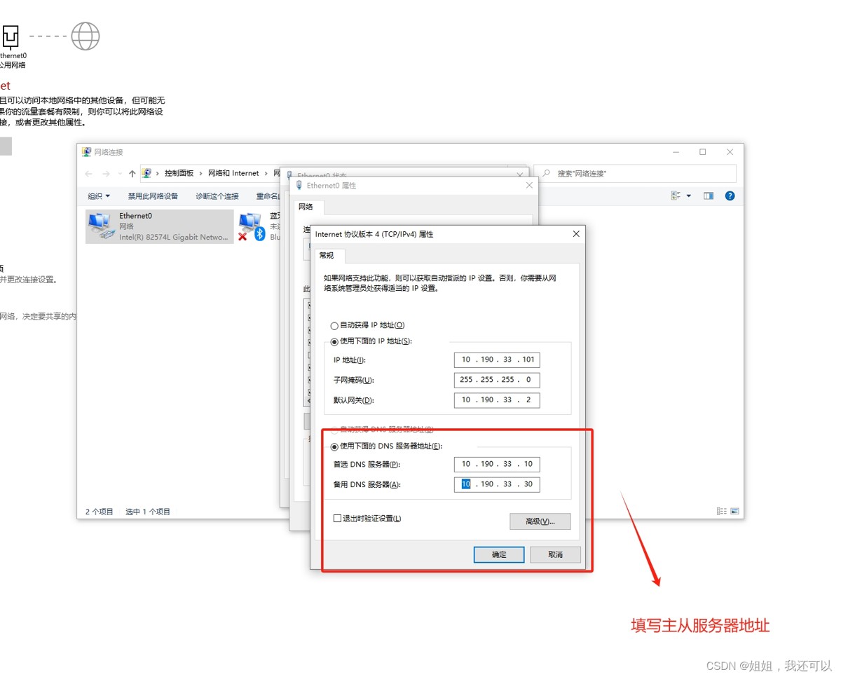 ## 同时按win键+R键,(先win后R),调出“运行”对话框,然后输入cmd,点确定。 ipconfig/all ##查看本机所有网卡配置 ping 10.190.33.10 ##pingDNS服务器地址,确保可以和DNS主服务互相通信 ping 10.190.33.30 ##pingDNS服务器地址,确保可以和DNS从服务互相通信 ##在IP地址配置界面手动添加主DNS服务器地址:10.190.33.10,备用DNS服务器地址:10.190.33.30 nslookup www.wl.com ##解析域名“www.wl.com” nslookup 10.190.33.3