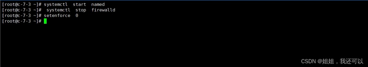 systemctl start named ##启动服务“named” systemctl stop firewalld ##停止服务“firewalld” setenforce 0 ##关闭防火墙