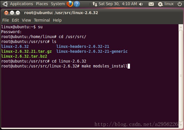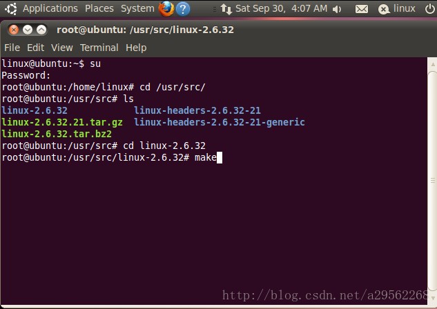 - 2.切换到root权限下进入内核源码文件夹 cd /usr/src/linux-2.6.32:
