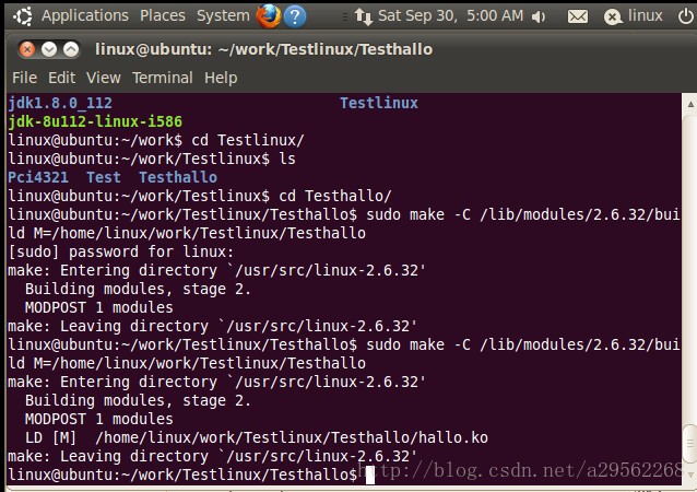 我增加了make编译指定,make -C /lib/modules/2.6.32/build M=/home/linux/work/Testlinux/Testhallo(这种方式成功编译出了.ko文件在别的工程中也是如此);
