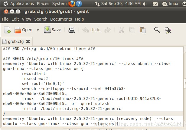 10.更改启动文件:gedit /boot/grub/grub.cfg ,然后找到安装的内核信息位置放到原来内核信息的上面(大括号内为内核的启动信息);