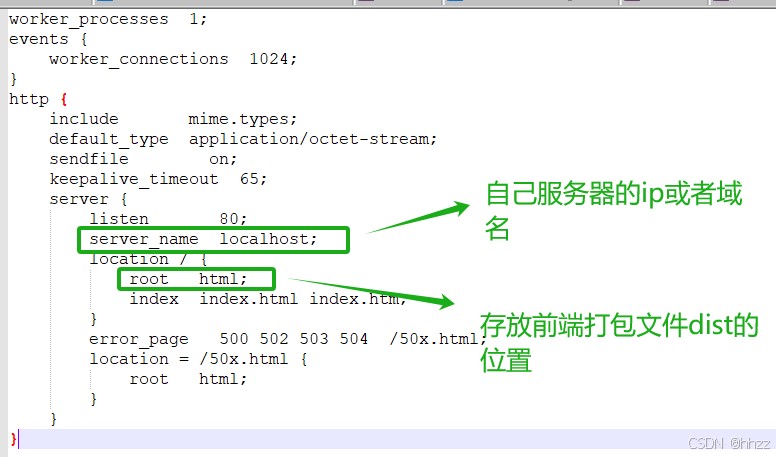 默认简单的配置:指定server_name和root,nginx代理的ip是xxx,然后我放在服务器的文件在html文件夹即可。nginx便会在用户访问这个ip时,自动的将html文件夹中的index.html返回到浏览器来展示页面。