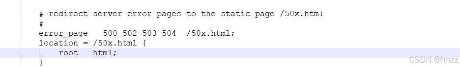 error_page 500 502 503 504 /50x.html; # 出现对应的http状态码时,使用50x.html回应客户