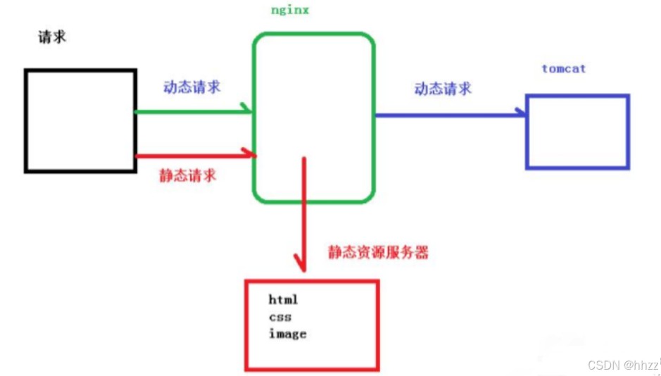 一般来说,都需要将动态资源和静态资源分开,将静态资源部署在Nginx上,当一个请求来的时候,如果是静态资源的请求,就直接到nginx配置的静态资源目录下面获取资源,如果是动态资源的请求,nginx利用反向代理的原理,把请求转发给后台应用去处理,从而实现动静分离。