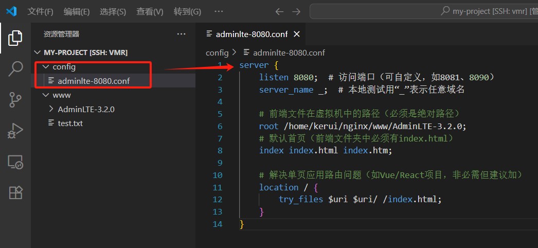 # 进入配置文件目录 cd ~/my-project/config # 新建配置文件(文件名建议包含端口或项目名,如adminlte-8080.conf) vim adminlte-8080.conf