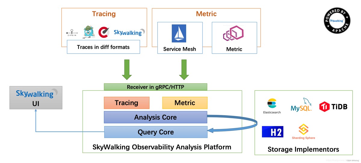 - 2)下部分 SkyWalking OAP :负责接收 Agent 发送的 Tracing 数据信息,然后进行分析(Analysis Core) ,存储到外部存储器( Storage ),最终提供查询( Query )功能。
