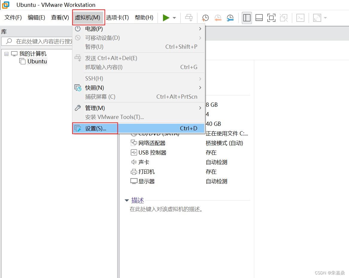 (1)打开VMware,依次点击“虚拟机”→“设置”。