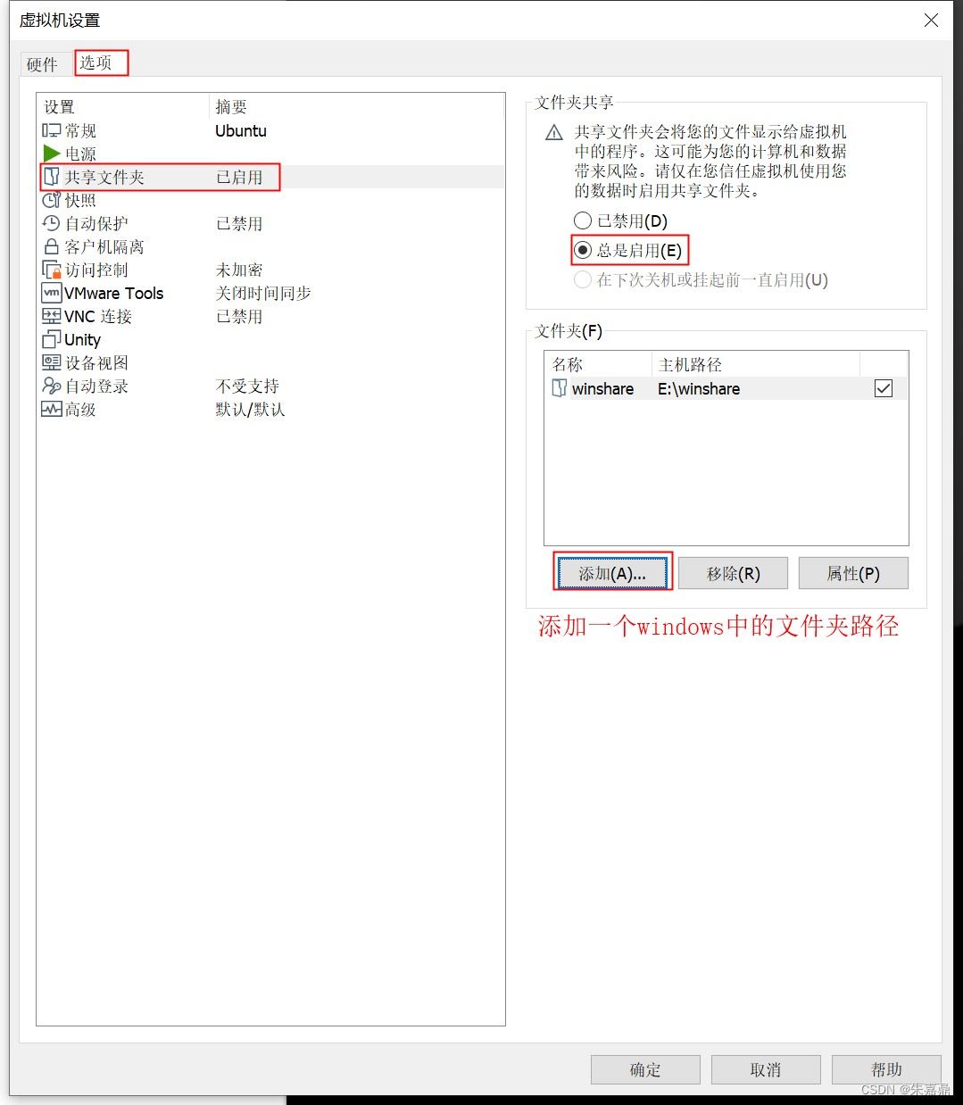 (2)依次点击“选项”→“共享文件夹”,配置如下,点击确定。