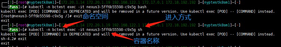 kubectl exec -it podname[刚刚查到的容器名字] bash kubectl exec -it podname[刚刚查到的容器名字] sh