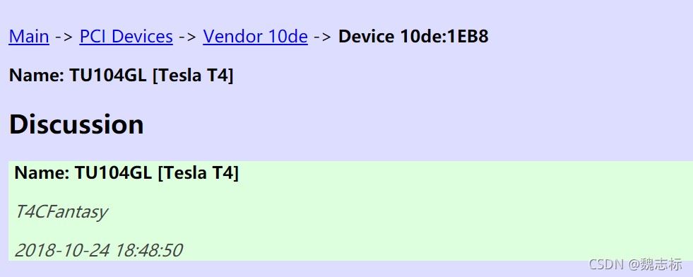 [root@icompute07 ~]# lspci -nn | grep NV af:00.0 3D controller [0302]: NVIDIA Corporation TU104GL [Tesla T4] [10de:1eb8] (rev a1)