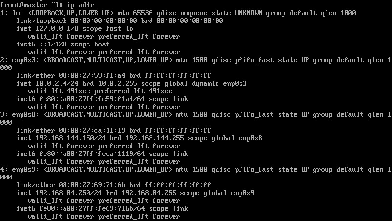 确认各个网卡的名称,默认是enp0s3对应网卡1(NAT),enp0s8对应网卡2(桥接网卡),enp0s9对应网卡3(仅主机)。上图是我配置好的网卡信息,因此如果不同先不用关注。