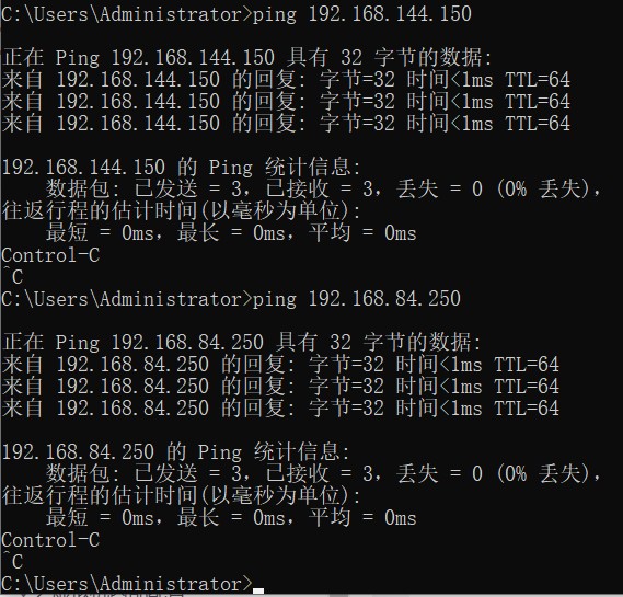 ping 192.168.144.150 # 验证虚拟机桥接网卡是否配置成功 ping 192.168.84.250 # 验证虚拟机仅主机网卡是否配置成功