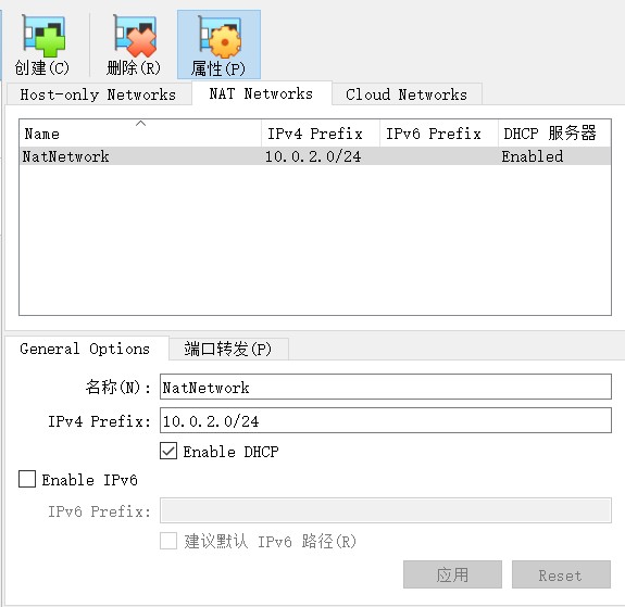 然后点击“创建”,得到名为“NatNetwork”的网络,默认ip为10.0.2.0/24:
