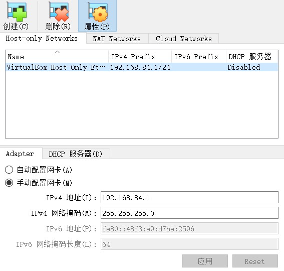 依次点击“管理”=>“工具”=>“Network Manager”,然后在“Host-only Networks”选项下点击“创建”,得到一个名为VirtualBox Host-Only Ethernet Adapter的网络,ip默认为192.168.56.x(如果之前创建过并删除,可能就会和我一样ip就会变):