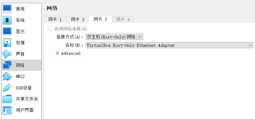 然后选中虚拟机,配置网卡3为仅主机(Host-Only)网络,名称选择刚刚创建的VirtualBox Host-Only Ethernet Adapter: