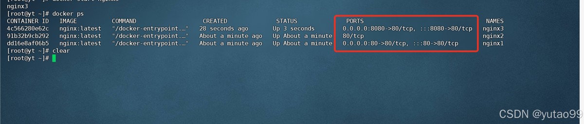 可以发现nginx1和nginx3这两个容器均有端口映射,而nginx2没有,这就是nginx2不能被浏览器访问的原因