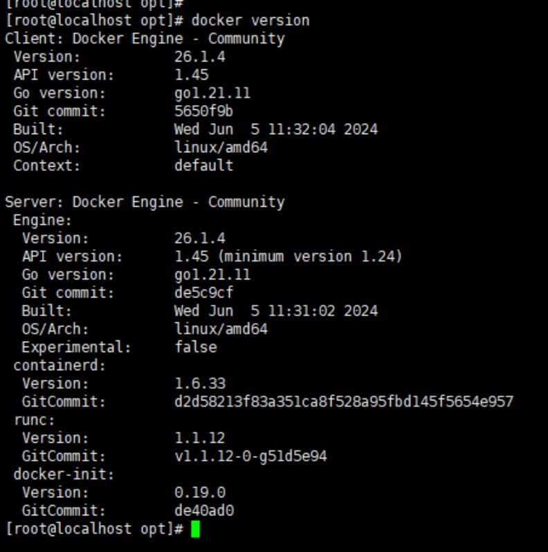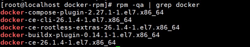 # 指定版本安装 yum install -y docker-ce-3:26.1.4-1.el7.x86_64 # 安装最新版本docker yum install -y docker-ce docker-ce-cli containerd.io docker-buildx-plugin docker-compose-plugin
