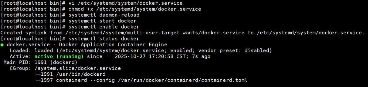 # 赋予文件权限 chmod +x /etc/systemd/system/docker.service # 重载配置 systemctl daemon-reload # 启动docker systemctl start docker #设置开机自启 systemctl enable docker # 验证服务状态 systemctl status docker