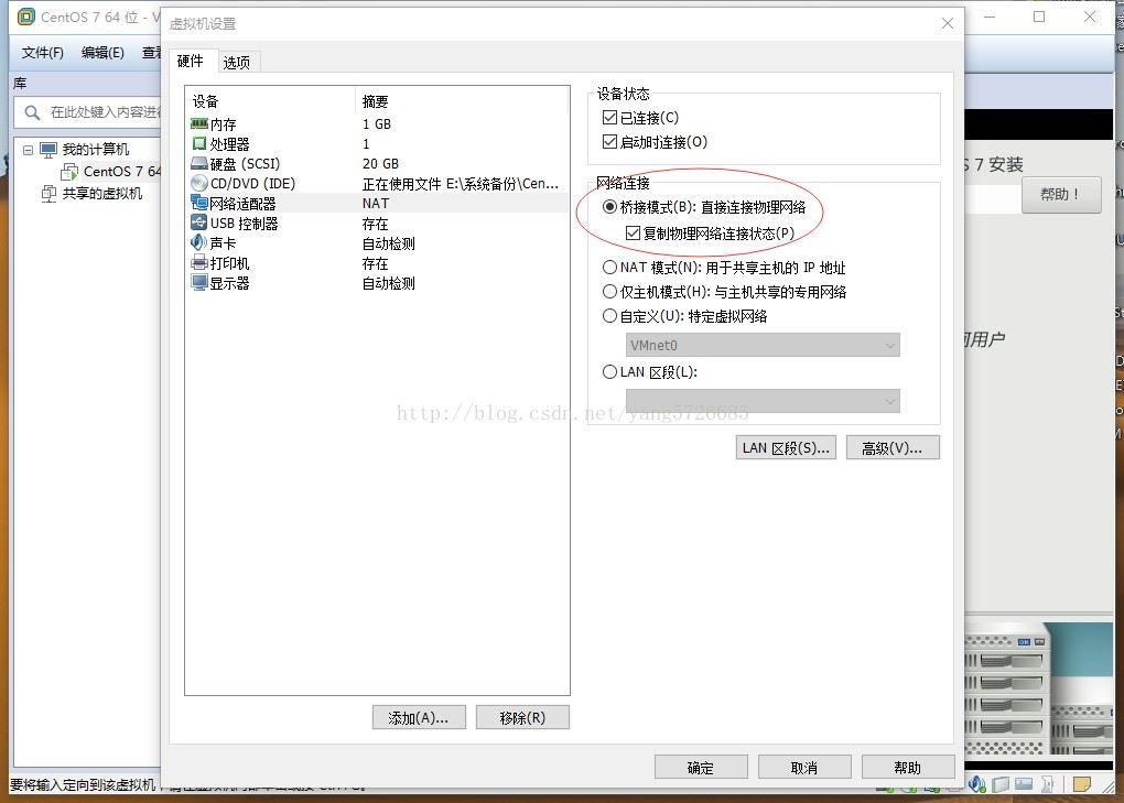 1 BRIDGE:相当于主机和虚拟机连接到同一个hub上,虚拟机要和主机配置到同一网段上