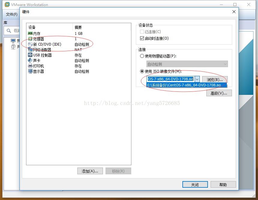 点击”CD/DVD(IDE)”,打开虚拟机光盘设置页面,点击”使用ISO镜像文件”,选择待安装的ISO镜像文件。就是刚刚下载的CentOS-7.0-1406-x86_64-DVD.iso文件。点击“确定”: