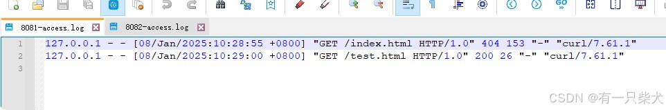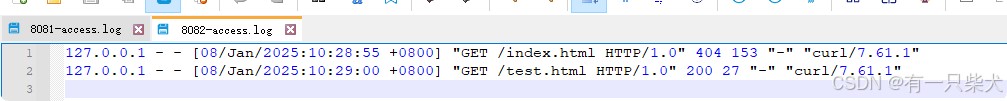- 8081和8082各自access log都有访问记录,且状态正常。