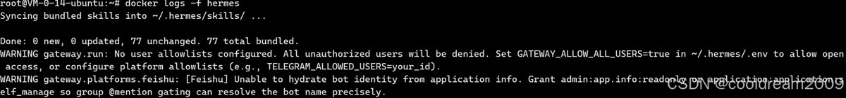 以上就是基于Docker部署Hermes Agent并接入飞书机器人的完整指南的详细内容,更多关于Docker部署Hermes Agent并接入飞书机器人的资料请关注脚本之家其它相关文章!