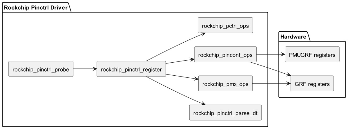 pinctrl_ops:提供引脚组信息、设备树节点到映射的转换(dt_node_to_map)等。pinmux_ops:提供复用功能数量、名称、组以及set_mux回调(最终写寄存器)。pinconf_ops:提供引脚或引脚组的电气特性读取/设置(如pin_config_set)。