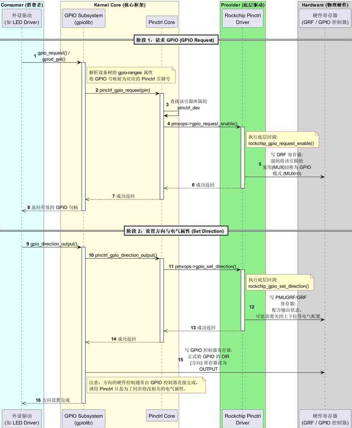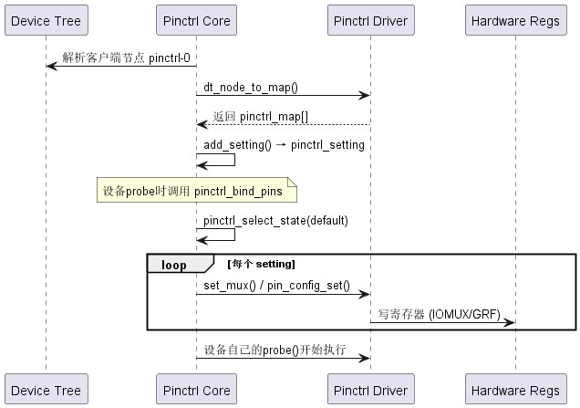 pinctrl_pm_select_*函数在 suspend/resume 中切换引脚状态,降低功耗。驱动需要主动调用这些函数。 - GPIO 交互: