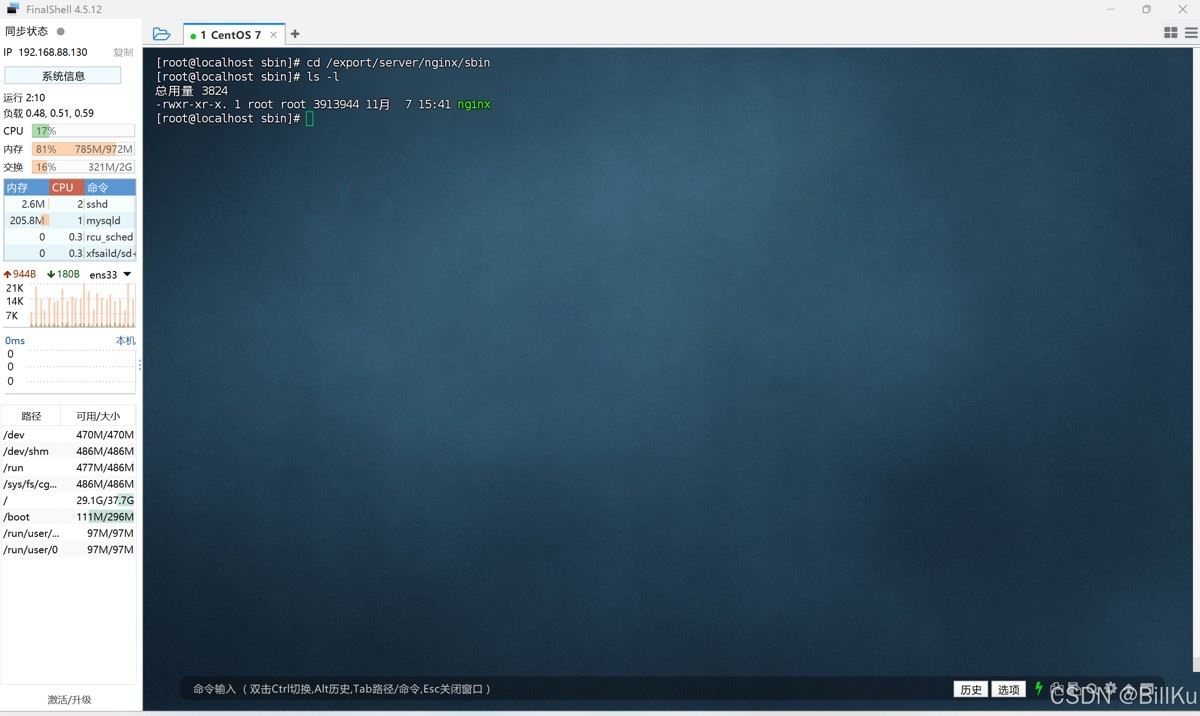 进入到 nginx 安装目录下的 sbin,即是目录 /export/server/nginx/sbin,查看目录内容