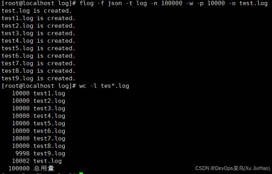 #生成 test.log 日志每个文件一万行 flog -f json -t log -n 100000 -w -p 10000 -o test.log