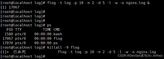 flog -t log -p 10 -n 2 -d 5 -l -w -o nginx.log &
