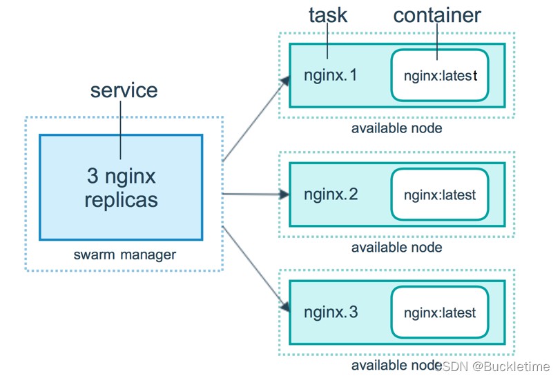 将服务部署到 swarm 时,swarm 管理器会接受您的服务定义作为服务的所需状态。然后,它将 swarm 中节点上的服务计划为一个或多个副本任务。这些任务在群中的节点上彼此独立运行。