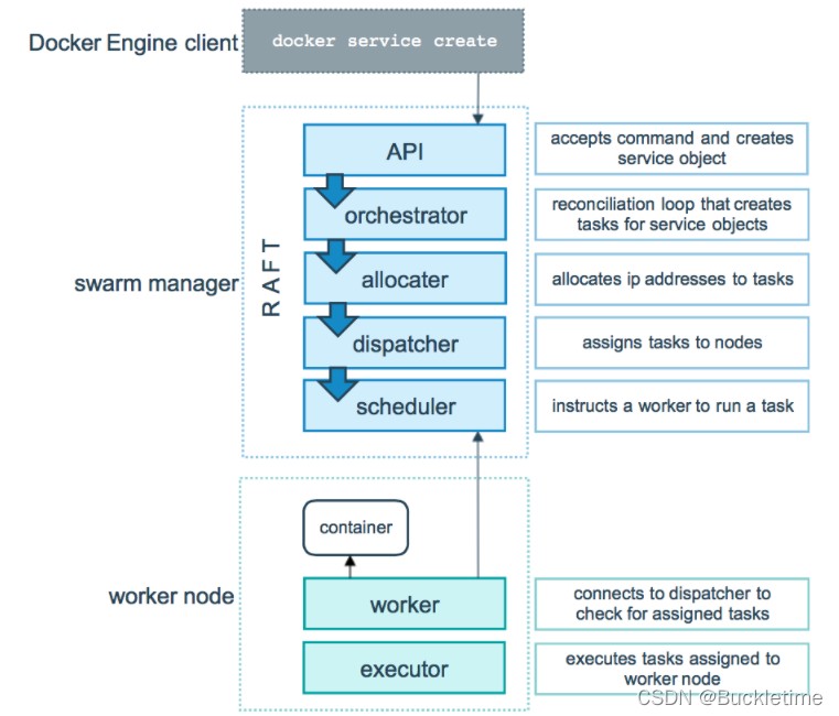 - 命令 -> manager节点 -> api -> 调度 -> worker节点(创建维护Task)