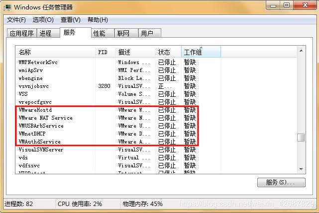打开任务管理器,选择服务标签,为了保险,开启所有的和vmware有关的服务,
