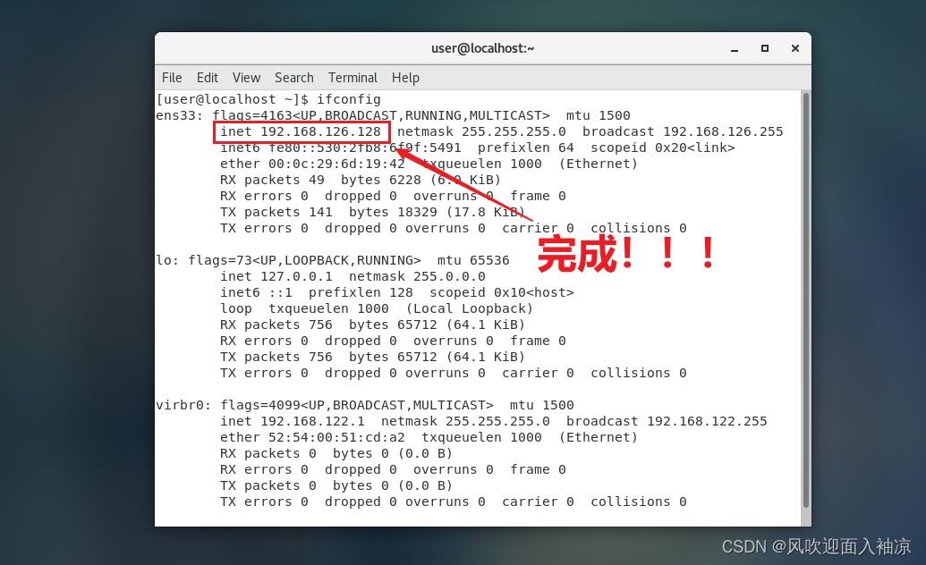 8.最后一步!!!输入我们的“ ifconfig ”再次查看IP地址可以看到它出现了!!!(直接拿捏)