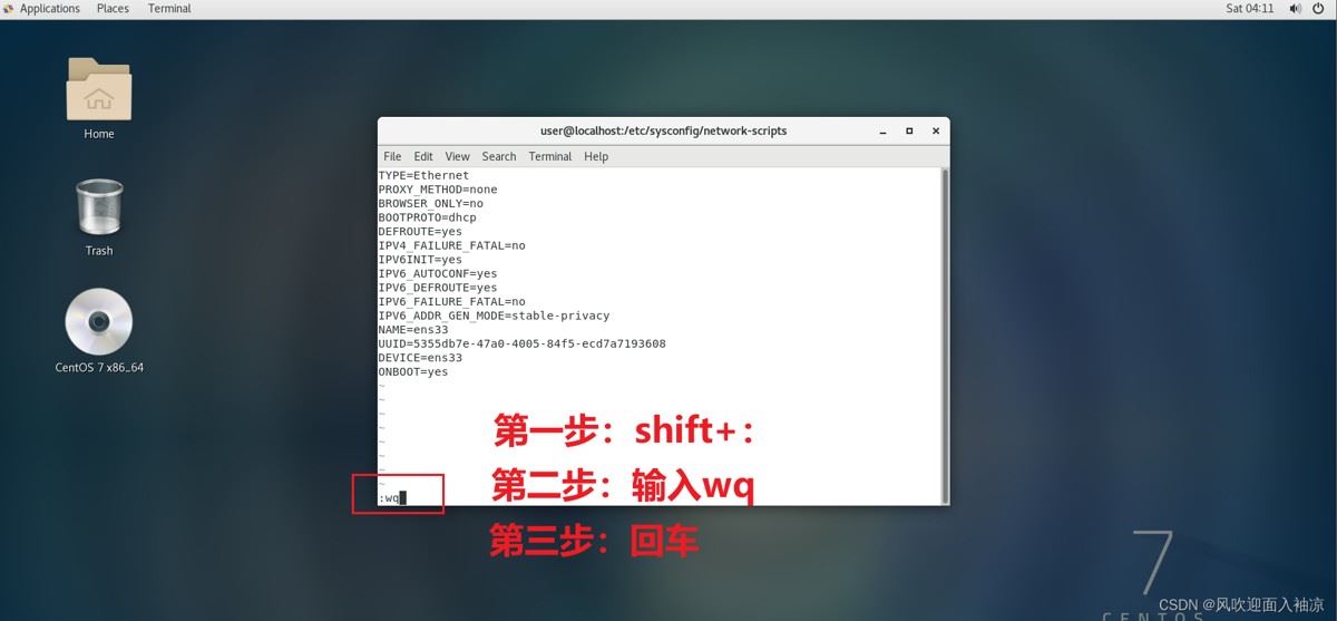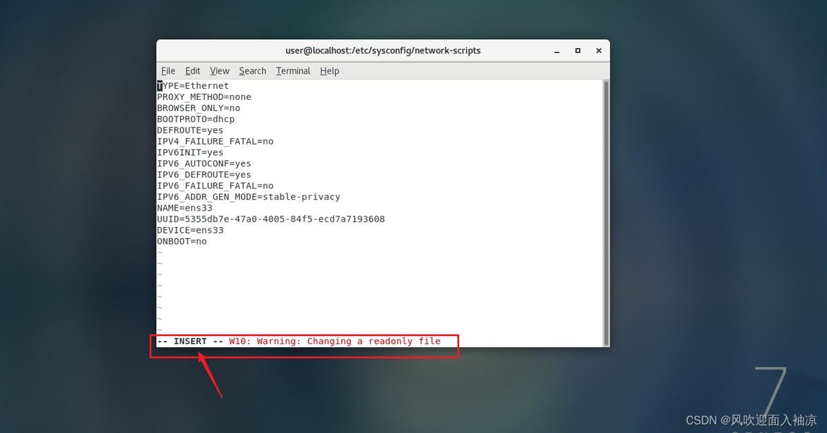 tip:该步骤可能保存会报错,提示ifcfg-ens33为只文件,此时可以使用su root命令切换一下root用户,再修改、保存就可以了。(具体步骤为:退出该文件,在窗口处输入su root,输入管理员密码,再根据文章继续接下来的操作即可。)